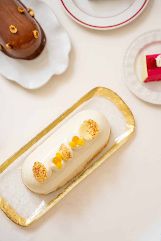 Plus fruitée, la Bûche Framboise Vanille joue sur la fraîcheur. Sous son glaçage marbré, elle cache un biscuit pâte à choux, une ganache vanille onctueuse, ainsi qu’un duo de framboise en crémeux et gelée, offrant une expérience à la fois vive et fondante.