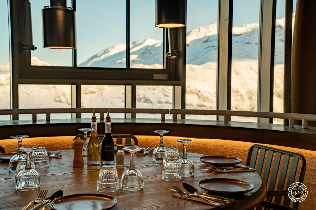 Depuis la salle centrale , le regard s’échappe naturellement vers un panorama spectaculaire. Grâce aux larges ouvertures vitrées, la montagne s’impose comme un décor vivant, changeant au fil des heures et des saisons. Ainsi, la lumière naturelle inonde l’espace, prolonge les volumes et crée un dialogue permanent entre l’architecture intérieure et le paysage extérieur. Installés au cœur de la salle, les convives dînent face à l’horizon, immergés dans une expérience où la vue devient un ingrédient essentiel du moment.