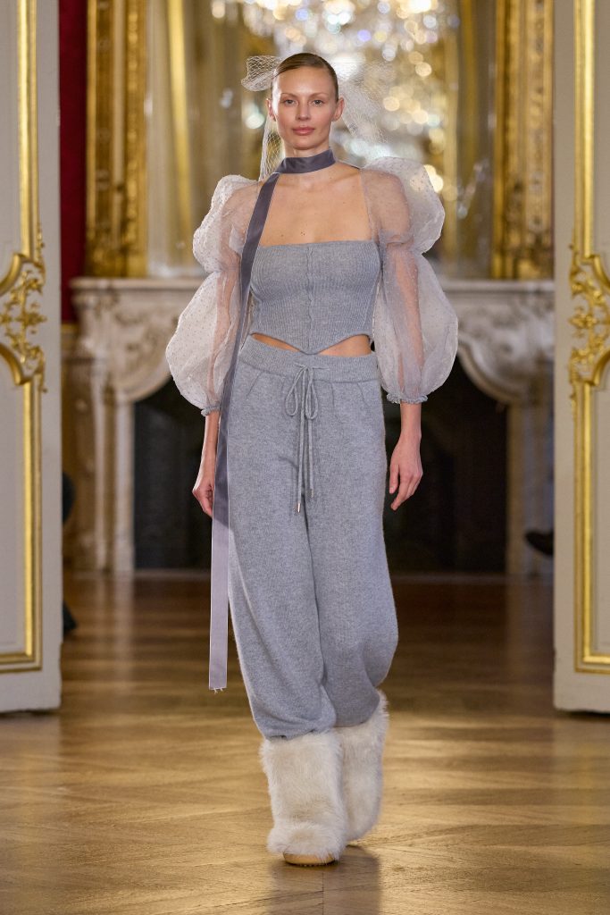 Les codes symboliques associés à Ganesha se déclinent à travers des constructions couture d’une grande précision. Les épaules délicatement encadrées par des volumes à plumes, les broderies légères éclatent comme des éclats de lumière, tandis que les textures de dentelle évoquent une protection douce et enveloppante. Les silhouettes, agrémentées de jupes détachables, rappellent que la couture peut aisément transiter du cérémonial au quotidien.
