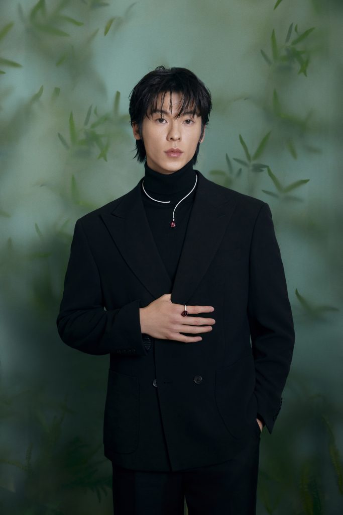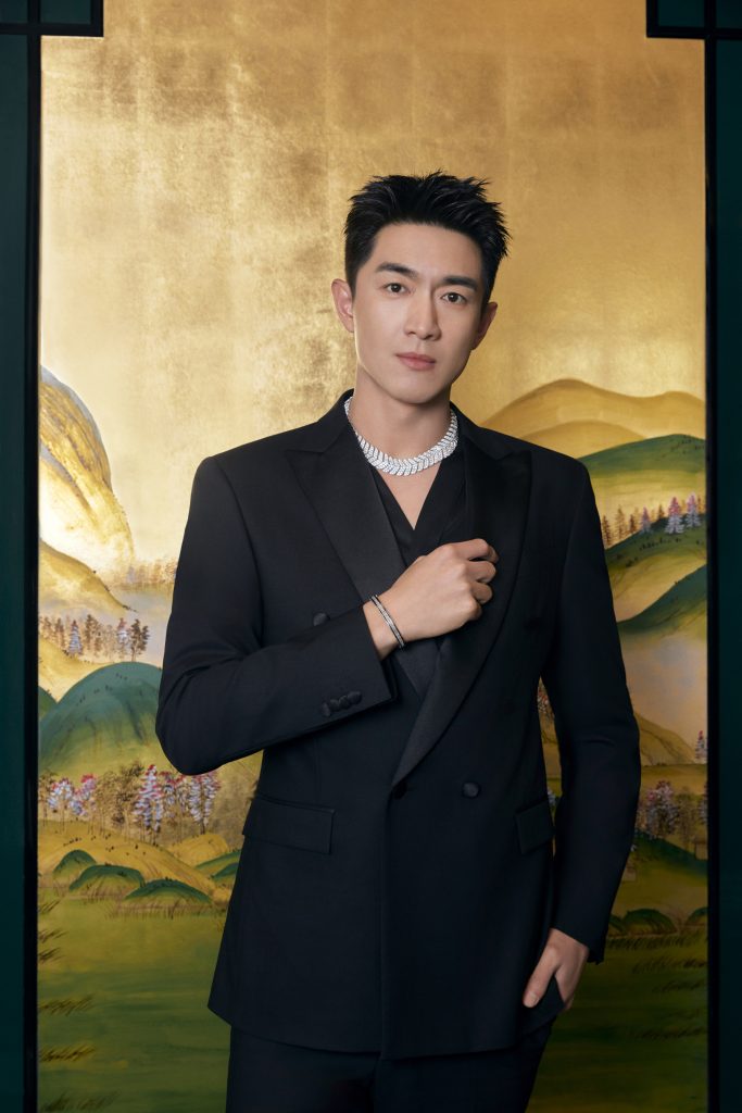 Les médaillés olympiques Xu Mengtao et Wang Xindi, figures du sport acrobatique, ont incarné l’esprit de précision et de performance de la Maison. Xu Mengtao portait le choker, les boucles d’oreilles et la bague Flèche, tous sertis de diamants en or blanc ; Wang Xindi arborait la broche Flèche, écho masculin délicat à la même ligne.