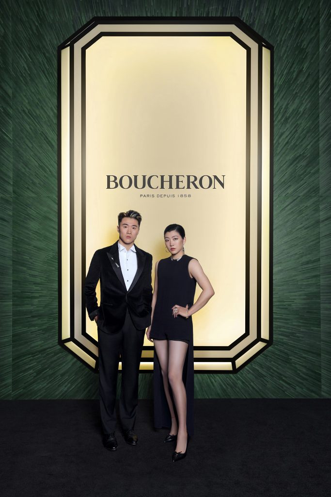 L’acteur Lin Gengxin incarnait, lui, une allure contemporaine et masculine : collier Chevron et bracelet Vendôme Liseré, pavés de diamants et rehaussés de laque noire. Pour l’exposition, il a porté les pièces maîtresses The Address — un spectaculaire diamant taille émeraude de 10,01 carats au col, accompagné d’une bague assortie de 4,31 carats — affirmant la virtuosité technique et la grandeur des créations Boucheron.